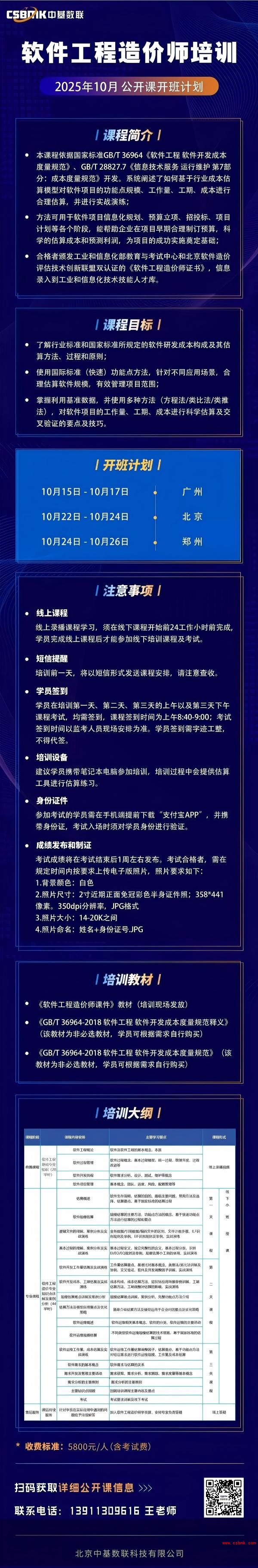 【软件工程造价师培训】10月开课通知(广州、北京、郑州)