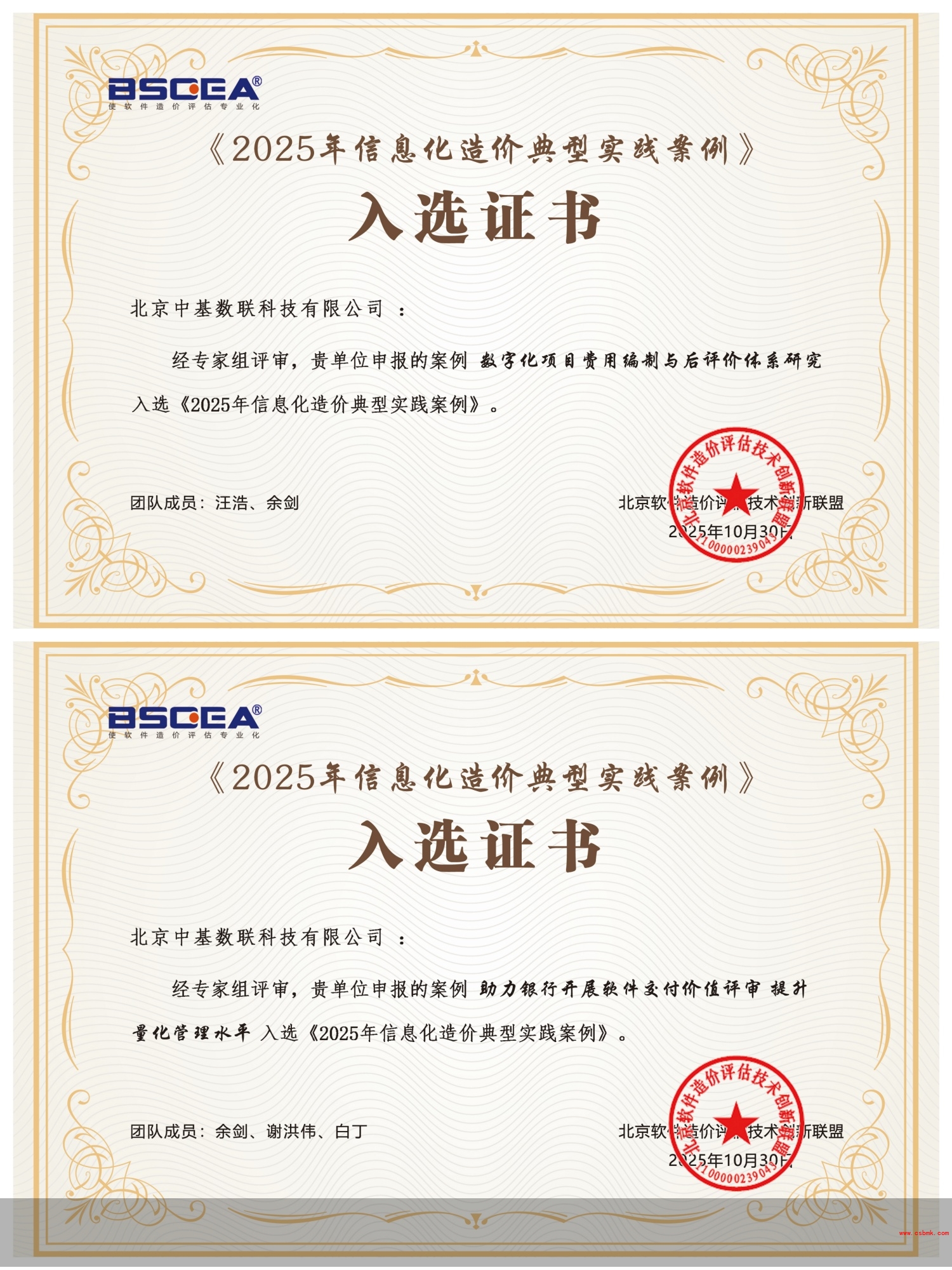 2025年10月30日,备受业界关注的《信息化造价典型实践案例(2025)》正式发布。本次案例征集由北京软件造价评估技术创新联盟等权威机构联合发起,旨在遴选并推广全国范围内在信息化造价领域具有标杆意义的优秀实践。经过多轮严格评审,中基数联凭借《数字化项目费用编制与后评价体系研究》与《助力银行开展软件交会价值评审 提升量化管理水平》 两大项目,从众多参选单位中脱颖而出,双双成功入选。一项是顶层方法论构建,一项是垂直行业深度实践,此次“双响炮”标志着业界对中基数联在信息化造价全链条服务能力的权威认可,也为相关行业的科学化、精细化管理提供了宝贵范本。